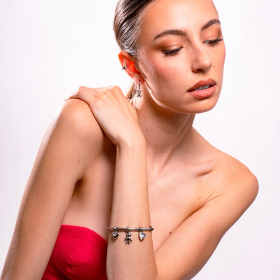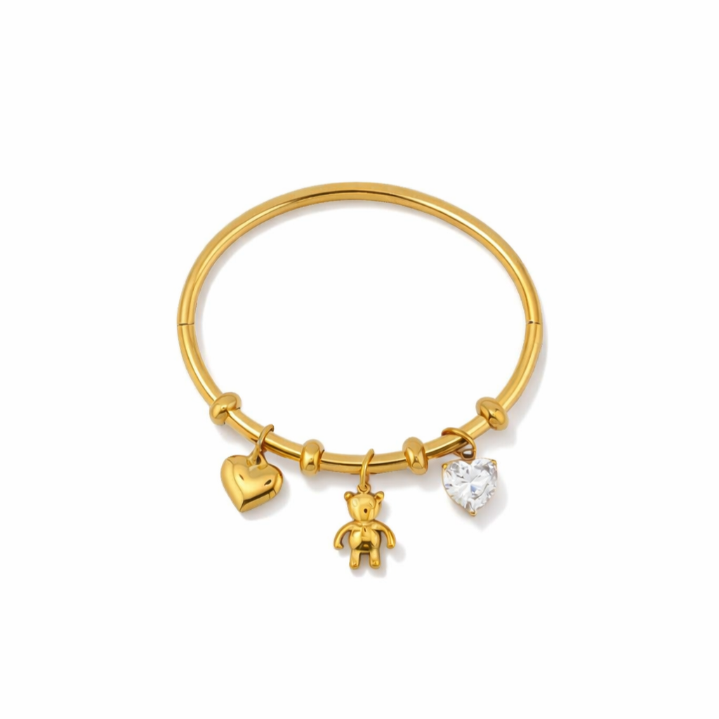 Questo bracciale manetta teddy è un gioiello unico, realizzato in acciaio inossidabile. Il charm e il cuore pendente aggiungono un tocco romantico e trendy.