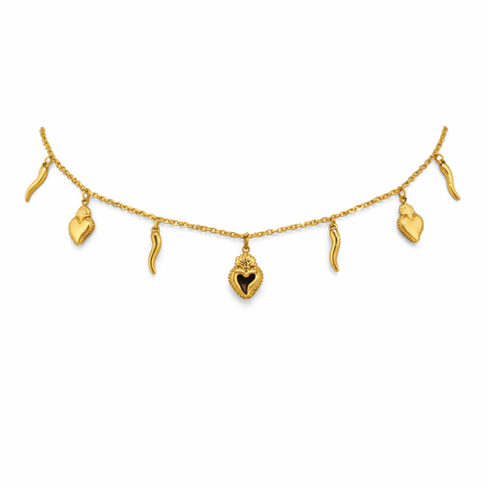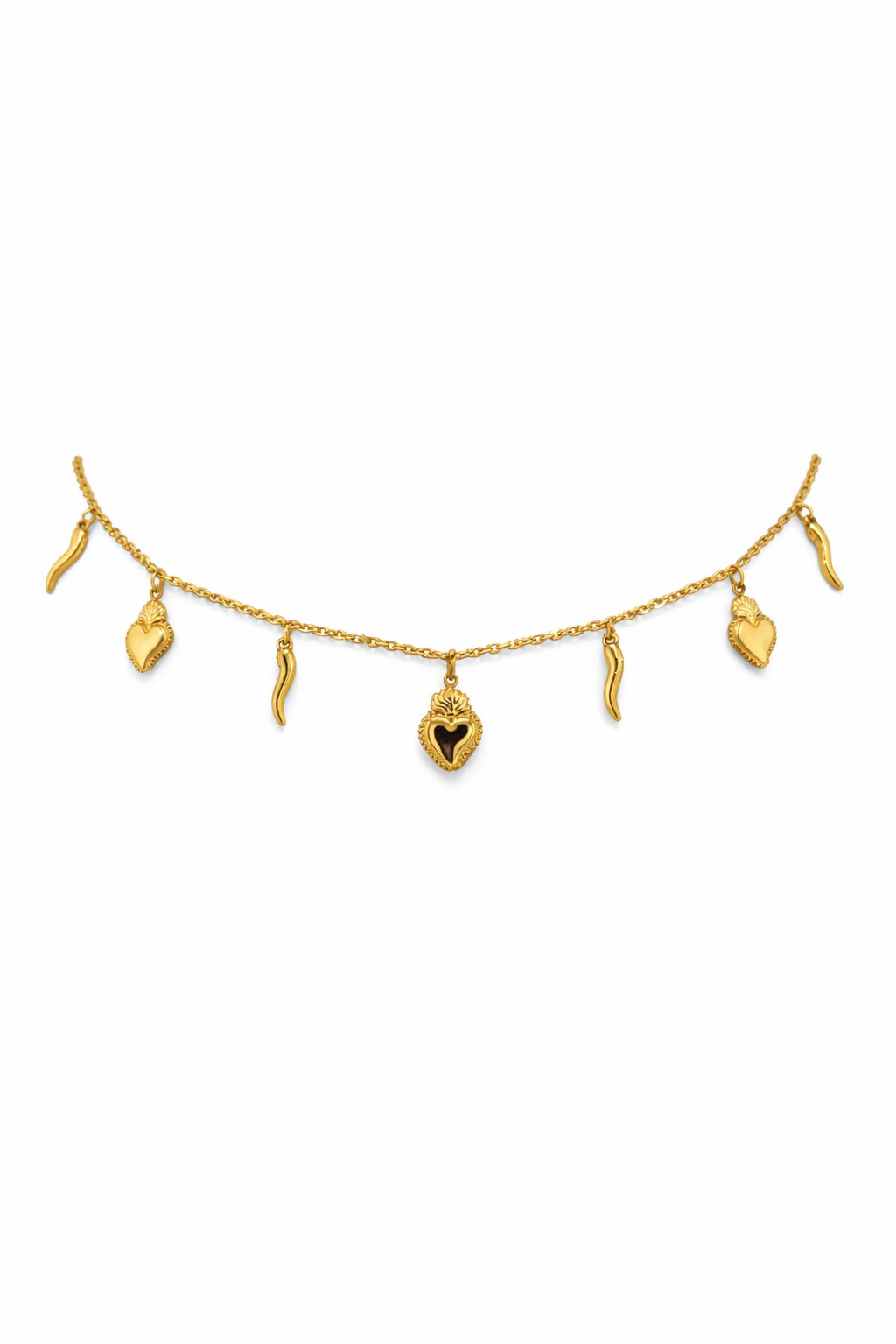 Aggiungi un tocco di fortuna al tuo outfit con la collana Fortunella. Realizzata in acciaio inossidabile, presenta ciondoli pendenti a forma di cuore sacro e corno. Lunga 40+5 cm, è un elegante accessorio che ti accompagnerà sempre con stile.