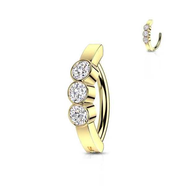 Elegante e moderno, il Clicker Trilogy è un piercing ombelico dal design raffinato e luminoso. Il suo stile distintivo è caratterizzato da tre pietre brillanti disposte in sequenza, che catturano la luce ad ogni movimento, donando un effetto scintillante e sofisticato.